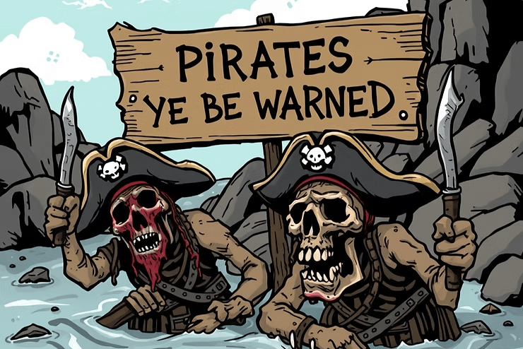 “Pirates ye be warned,” read the sign above the mangled, rotting corpses of the original private industry.